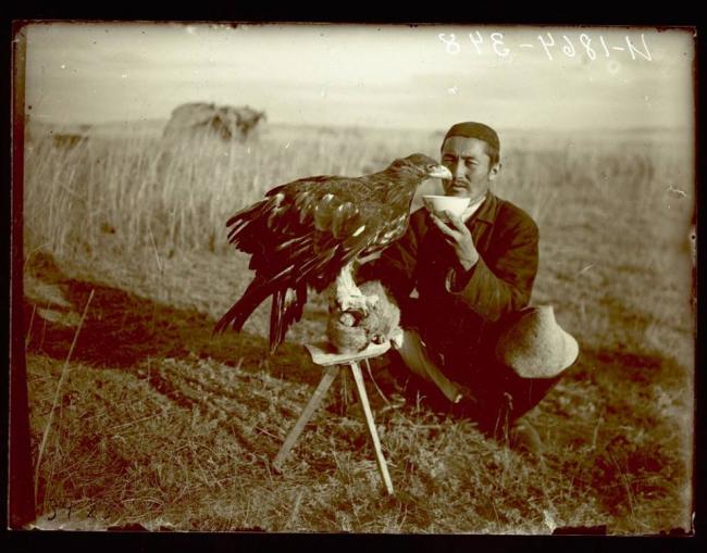 Feeding Golden Eagle by Kazakhi falconer in Karaganda Region in 1929