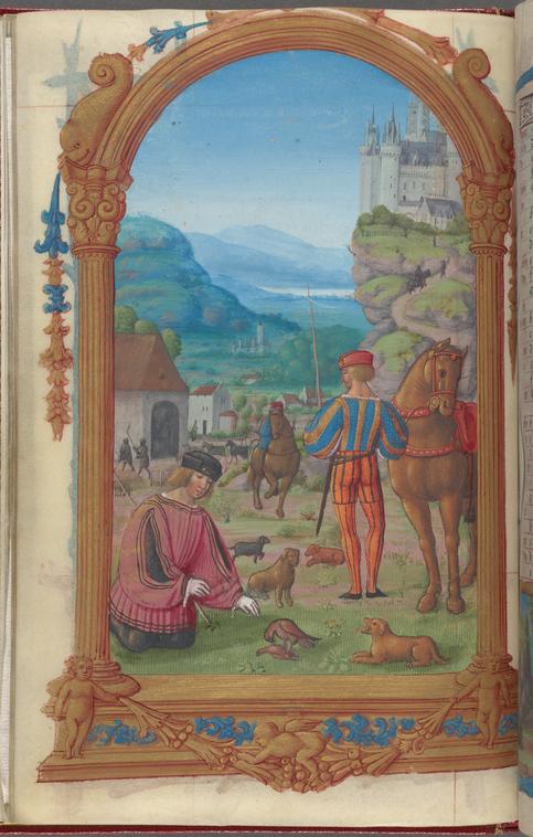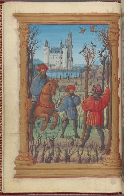 Full-page miniature of hunting, with wood-cutting in background, in November, fol. 12v