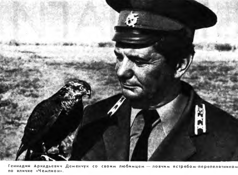 Gennadiy Arkadievich Demenchuk with his favourite Sparrowhawk "Champion"  and berkutchi Ashirbai Bee