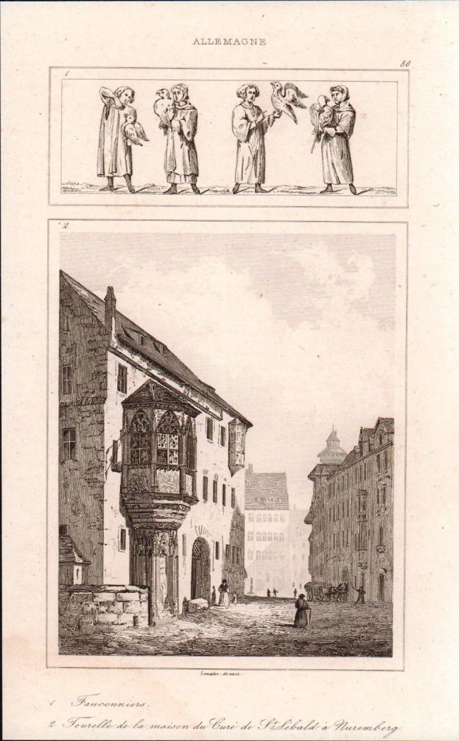 Gravure XIXe Fauconnier Tourelle Curé Église Saint Sébald à Nuremberg Nürnberg