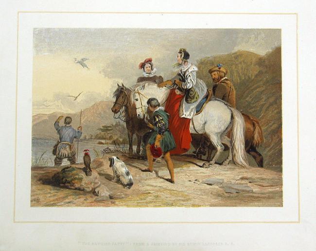 HORSES & HUNTERS MEDEIVAL HAWKING FALCONRY ~ Old 1851 Color LANDSCAPE Art Print