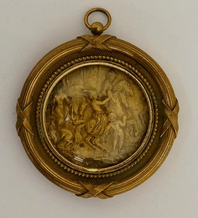 Hunting - A 19th Century gilt bas relief miniature of a falconry party with figures on horses