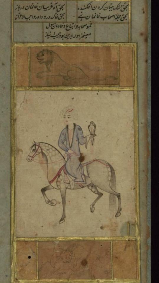Ottoman Turkish colored drawing of a falconer on horseback produced in the 11th century