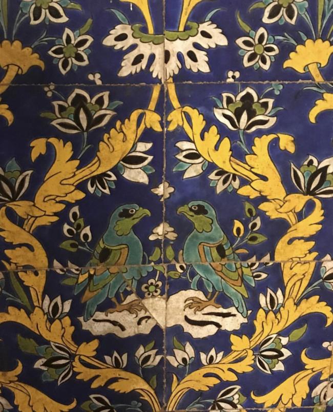 Persian tile with falconry scene from collection of Otto Wieblinger at Astrakhan Art Gallery named after P.M.Dogadin