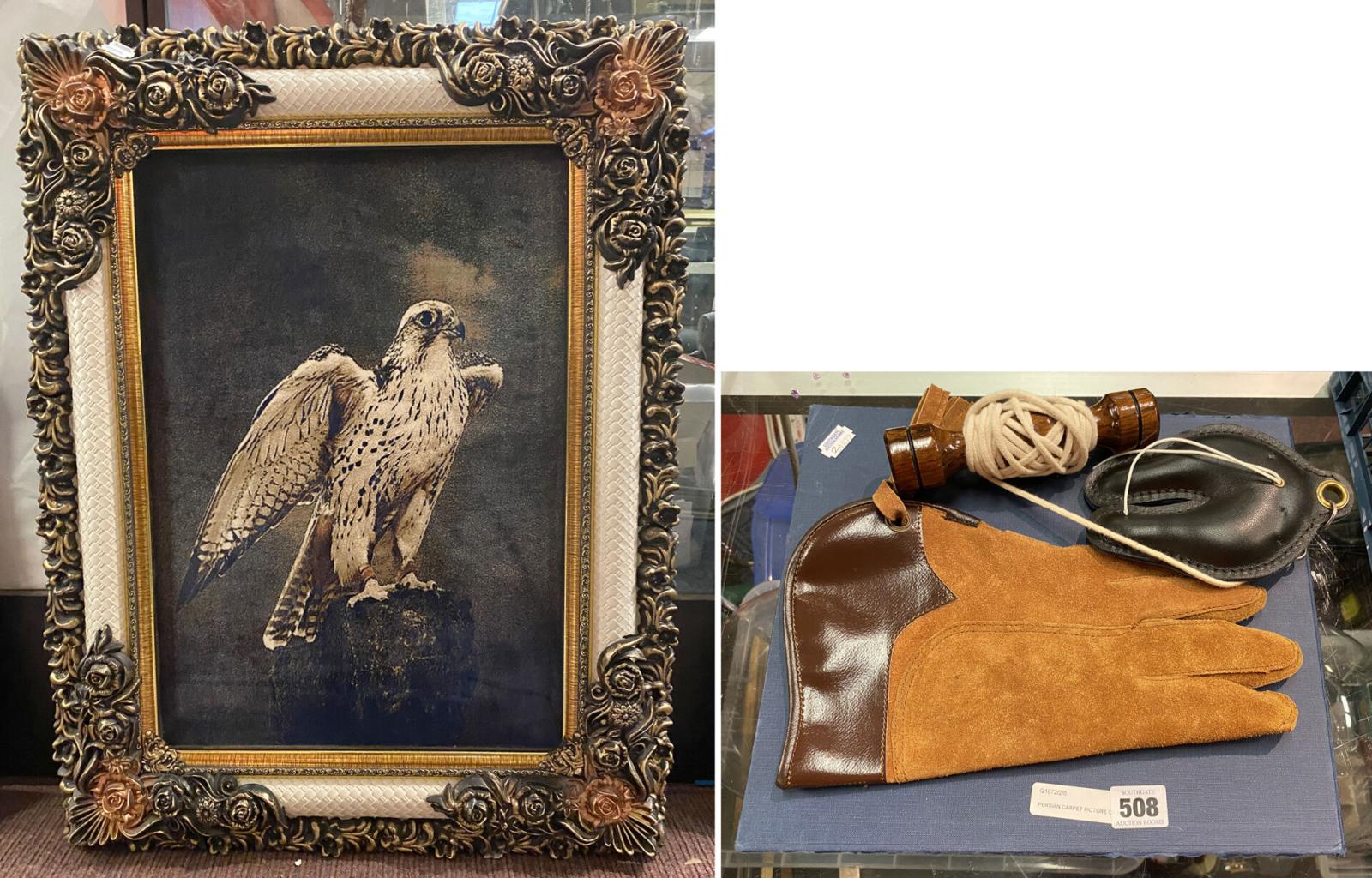 PERSIAN CARPET PICTURE OF GYR FALCON - SIGNED EMMA FORD PEREGRINE BOOK, CREANCE & GLOVE - FOUR FALCONRY ITEMS