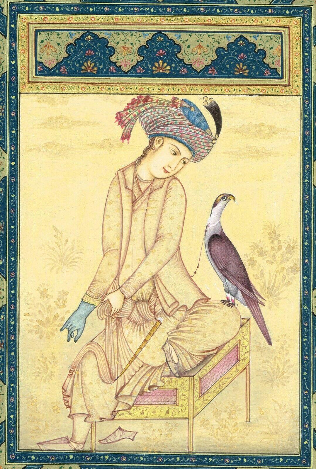 Persian Miniature Painting Of Youth With Falcon Gouache Painting 7x9.5 Inches