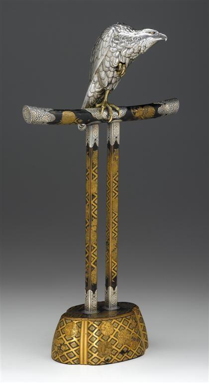 Japanese silvered bronze model of a hawk, on silver mounted lacquered stand.