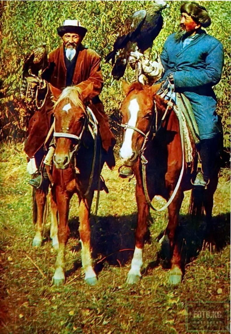 Kirghiz munishkers Beremkul Urmambetov with Gos (left) and berkutchi Ashirbai Beermanov (right) in 1
