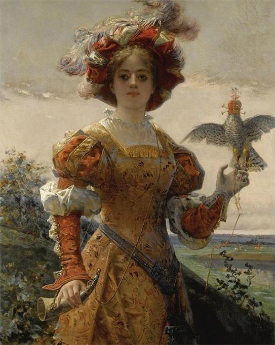 Painting by Edmond Louis Dupain (1847-1933) "Dame with a falcon"