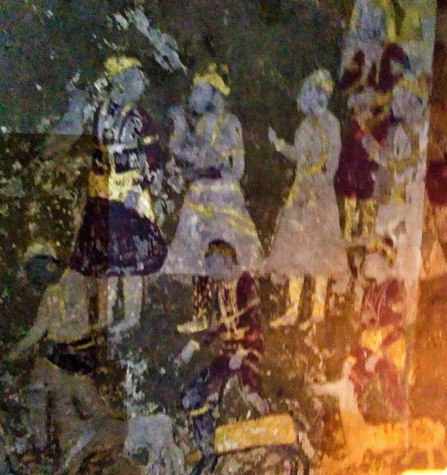 Sikh Era mural in the Sheesh Mahal (Palace of Mirrors) depicting two falconers, accompanied by hunte