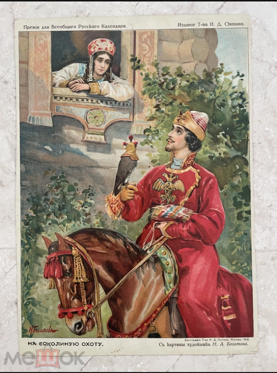 Sytin I.D. Lithograph 1914 Falconry from painting of artist Nikolai Alekseevich Bogatov (1854-1935)