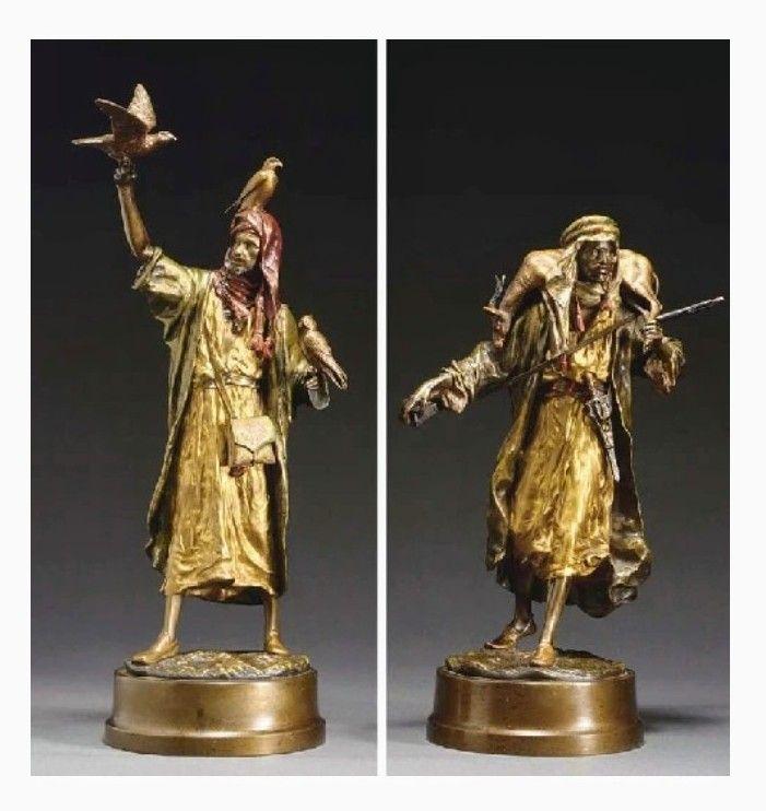 The Falconer ; The Return from the Hunt. Austrian School, 20th Century. Bronze with brown patina and