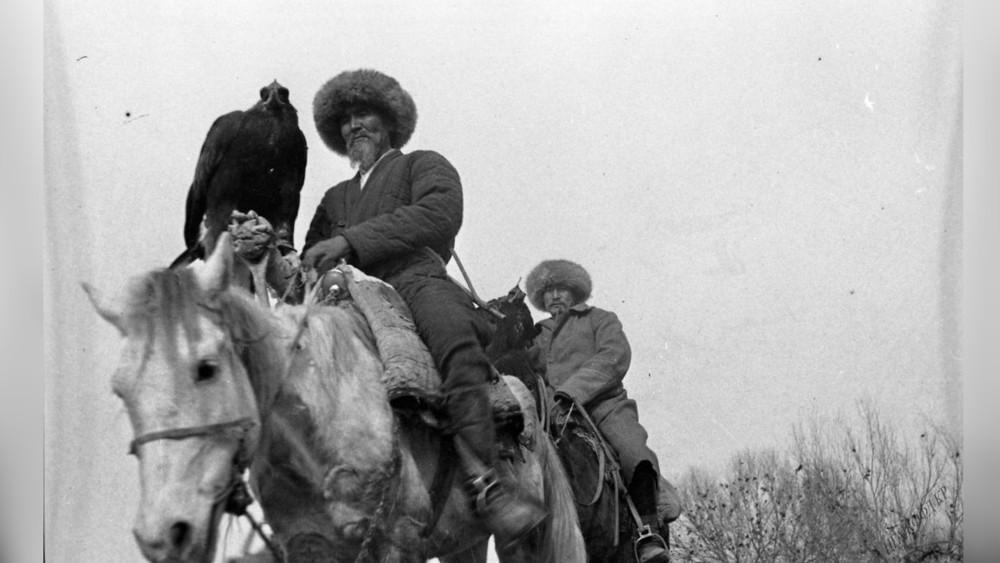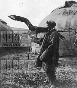 The Kyrhyz hunter with the Golden Eagle near his yurt during 1930-1937