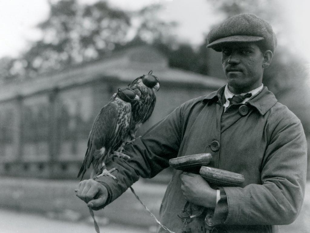 Two hooded falcons perching on the arm of their falconer at London Zoo, June 1923 (bw photo)